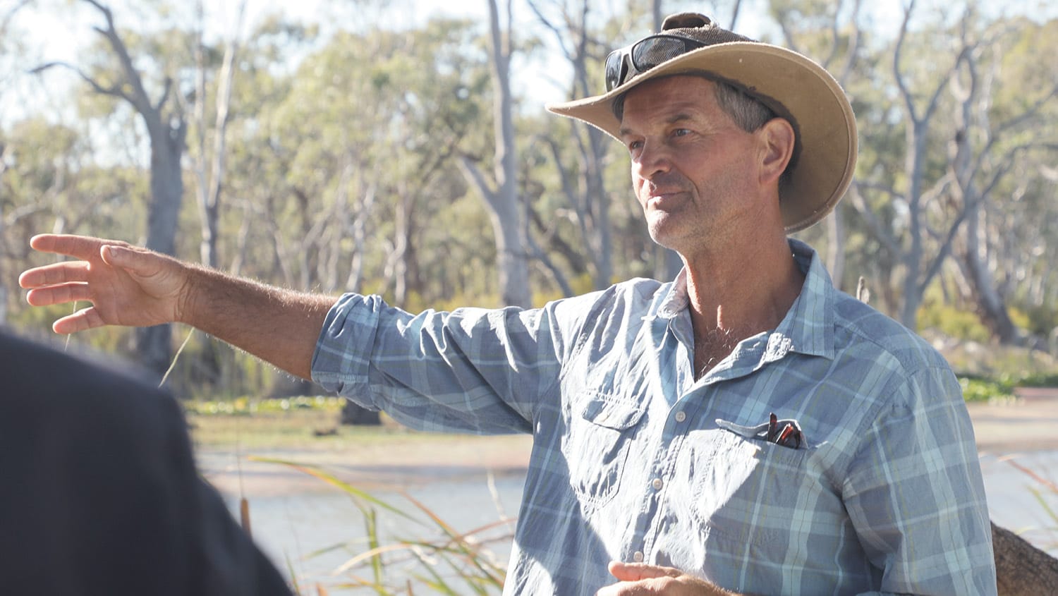 After the initial introduction in Gunbower, the party, flanked by Australian Federal Police officers, travelled to the property of John Toll. John runs a mixed sheep and cropping enterprise on 800 hectares and takes an integrated approach to agriculture and the environment. Planting over 40,000 trees over the past 20 years, not only are they a source of feed and shelter for the sheep but they also provide a wonderful habitat for native wildlife including birds, snakes, lizards, ants and bugs. Bird watchers have documented 45 different species of birds.