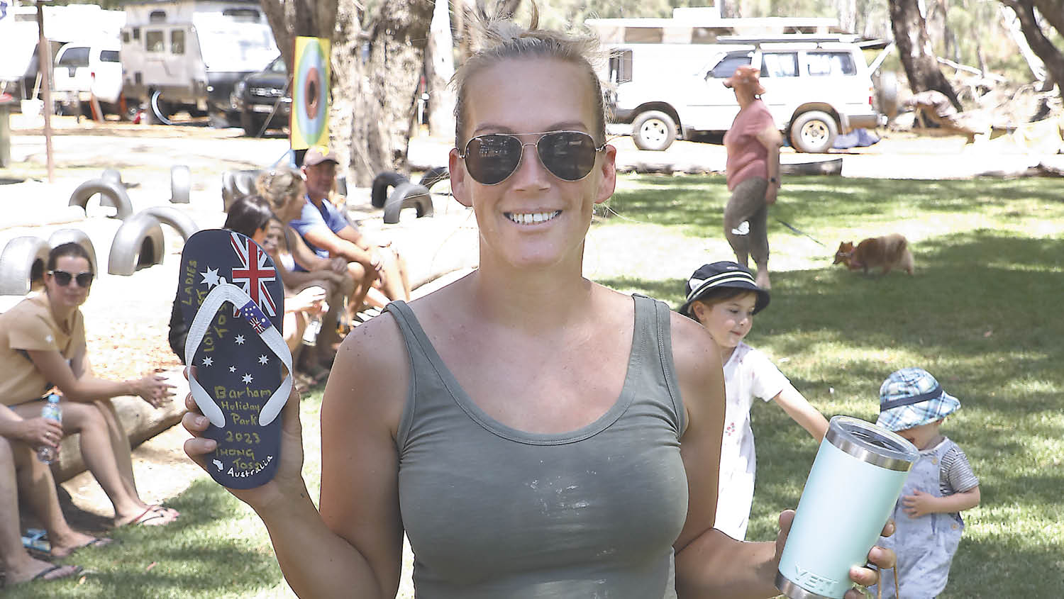It doesn’t get much more Aussie than pitching a thong down a green lawn against the Murray. Not to be confused with the US thong throwing, the 4th Annual Barham Holiday Park family-friendly Thong Throwing Championship was filled with highs and lows. From fantastic throws scuttled by trees, competitors’ agony at falling short (myself included) to the dizzying heights of longest-distance glory.